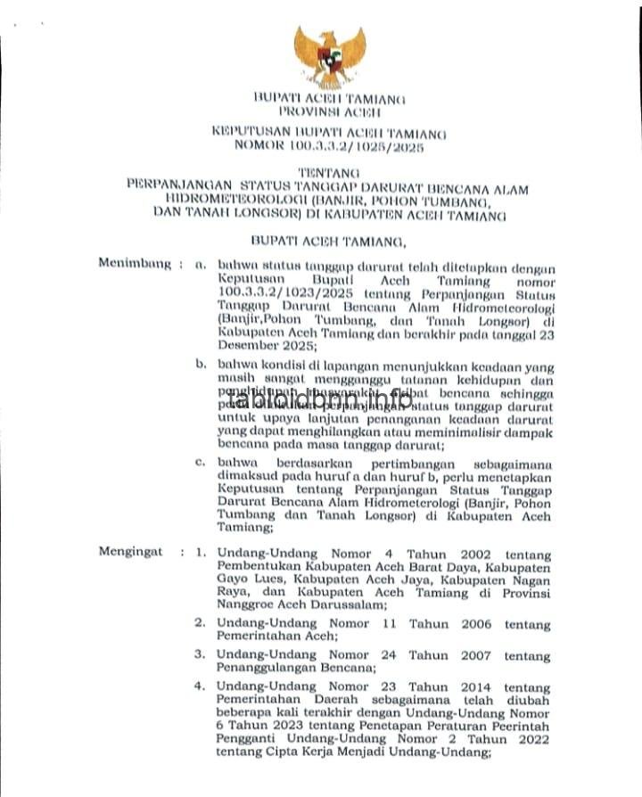 Tabloidbnn.info.Aceh Tamiang – Pemerintah Kabupaten Aceh Tamiang resmi memperpanjang masa Status Tanggap Darurat Bencana Alam Hidrometeorologi, yang meliputi banjir, pohon tumbang, dan tanah longsor. Rabu (24/12/25).
