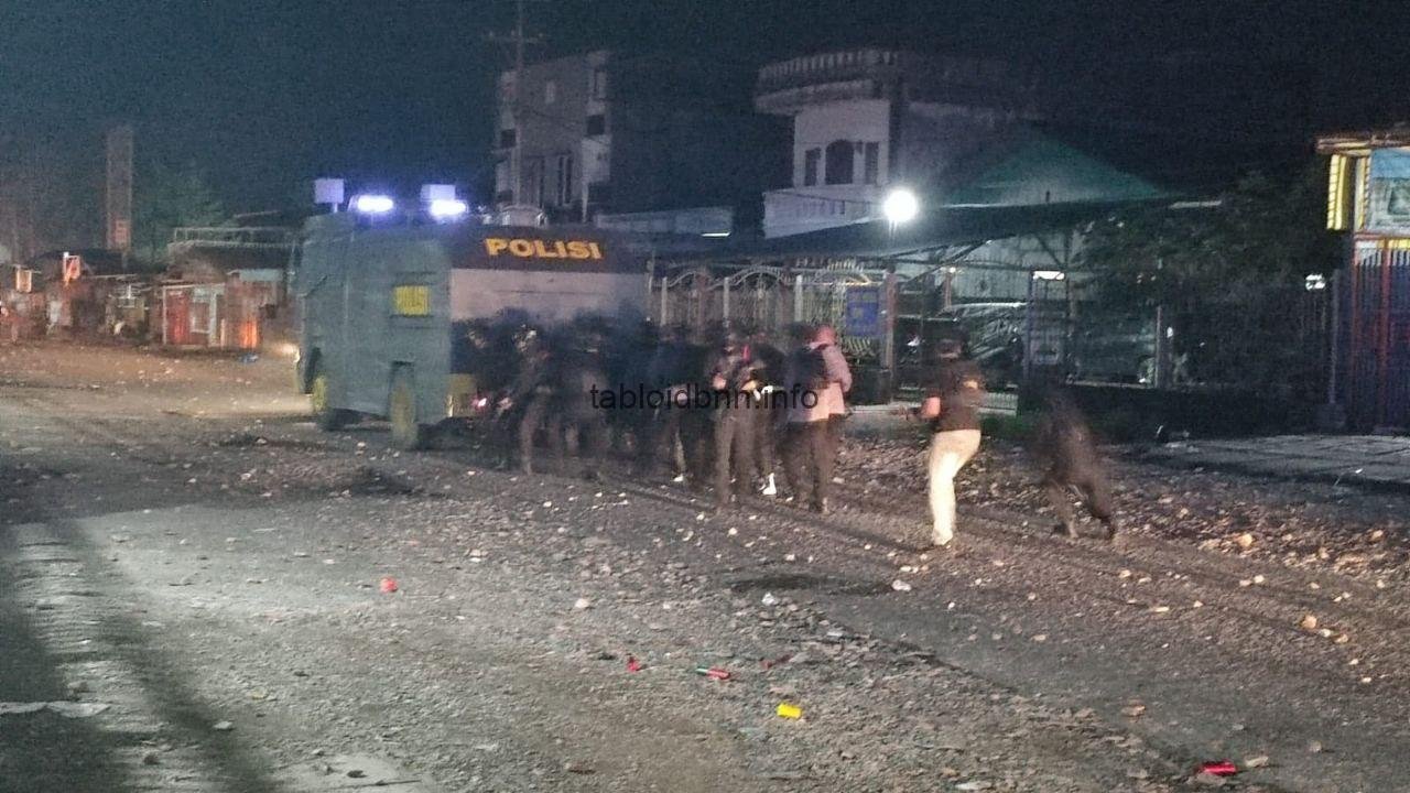 Aparat Kepolisian saat memukul mundur para pelaku aksi di pertigaan Gorong-gorong Timika, Senin (22/2) malam.