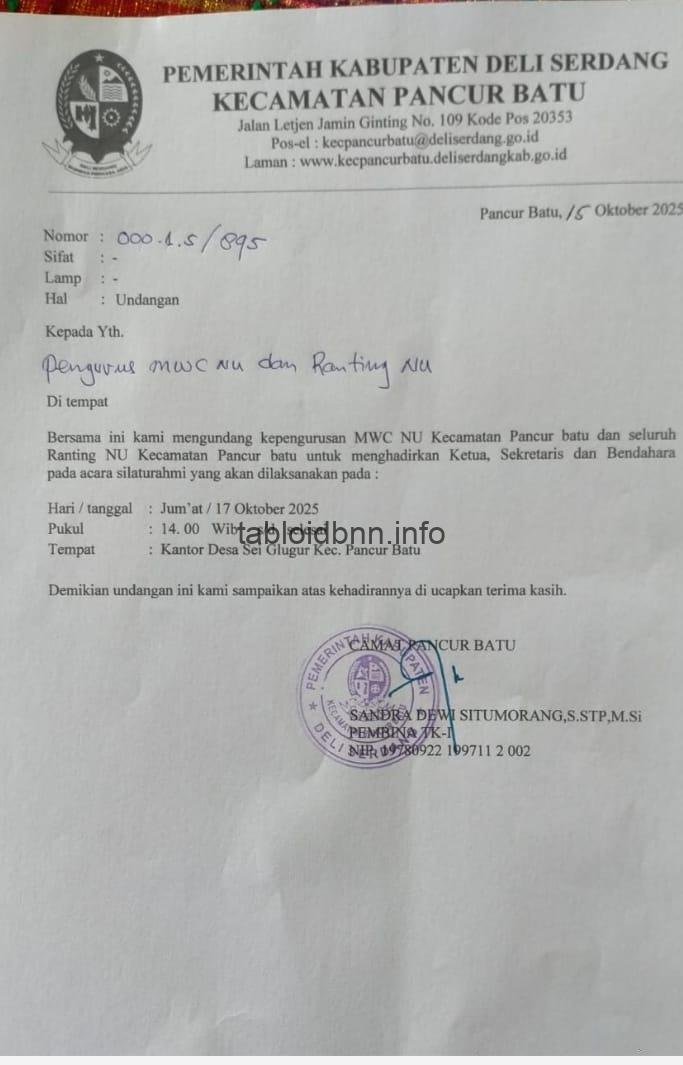 Tabloidbnn.info. Deli Serdang. Camat Sandra Dewi dinilai gagal fungsi sebagai Pembina Organisasi Kemasyarakatan di Kecamatan Pancur Batu. Sehubungan dengan kekisruhan persoalan Ketua MWC Nahdlatul Ulama (NU) Pancur Batu dengan 7 Pimpinan Anak Ranting NU, Sandra Dewi memfasilitasi Acara Silaturahmi dengan mengundang kedua belah Pihak di Balai Desa Sei Glugur 17/8.