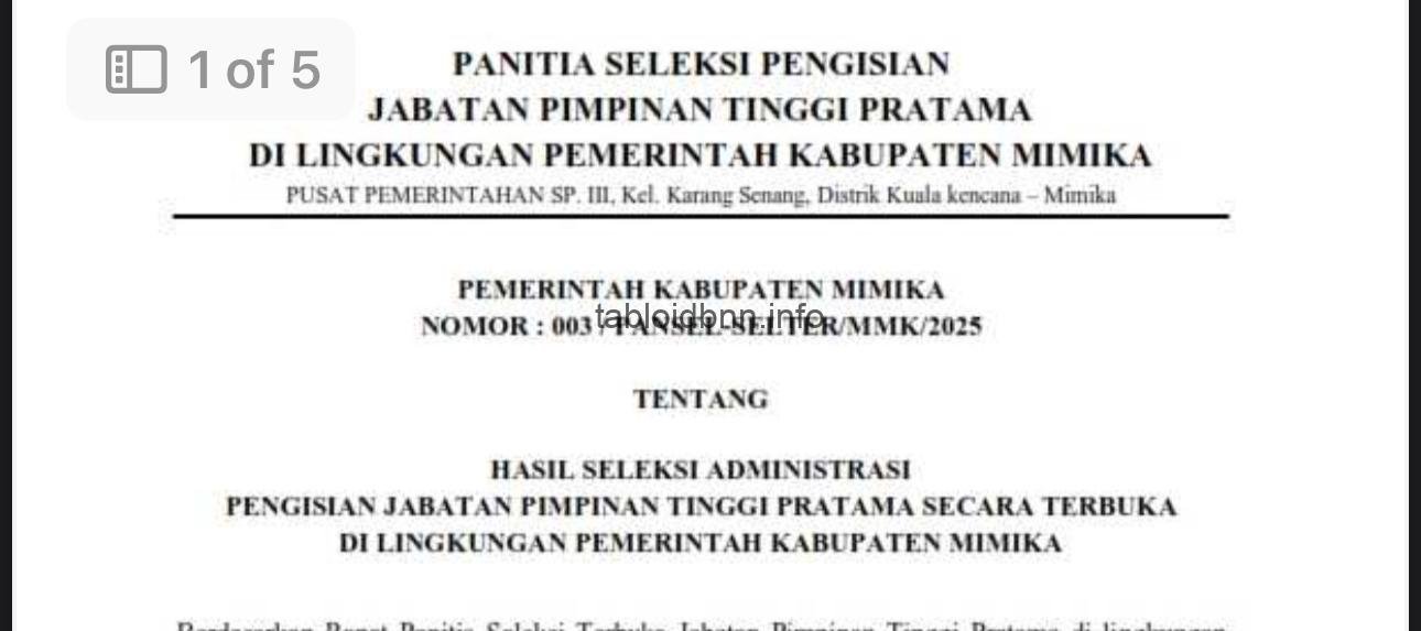 Panitia Pengisian Jabatan Tabloidbnn.info.Timika, – Panitia Seleksi Pengisian Jabatan Pimpinan Tinggi Pratama (JPT Pratama) Lingkup Pemerintah Kabupaten Mimika akhirnya mengumumkan hasil seleksi administrasi untuk 12 lowongan jabatan strategis.