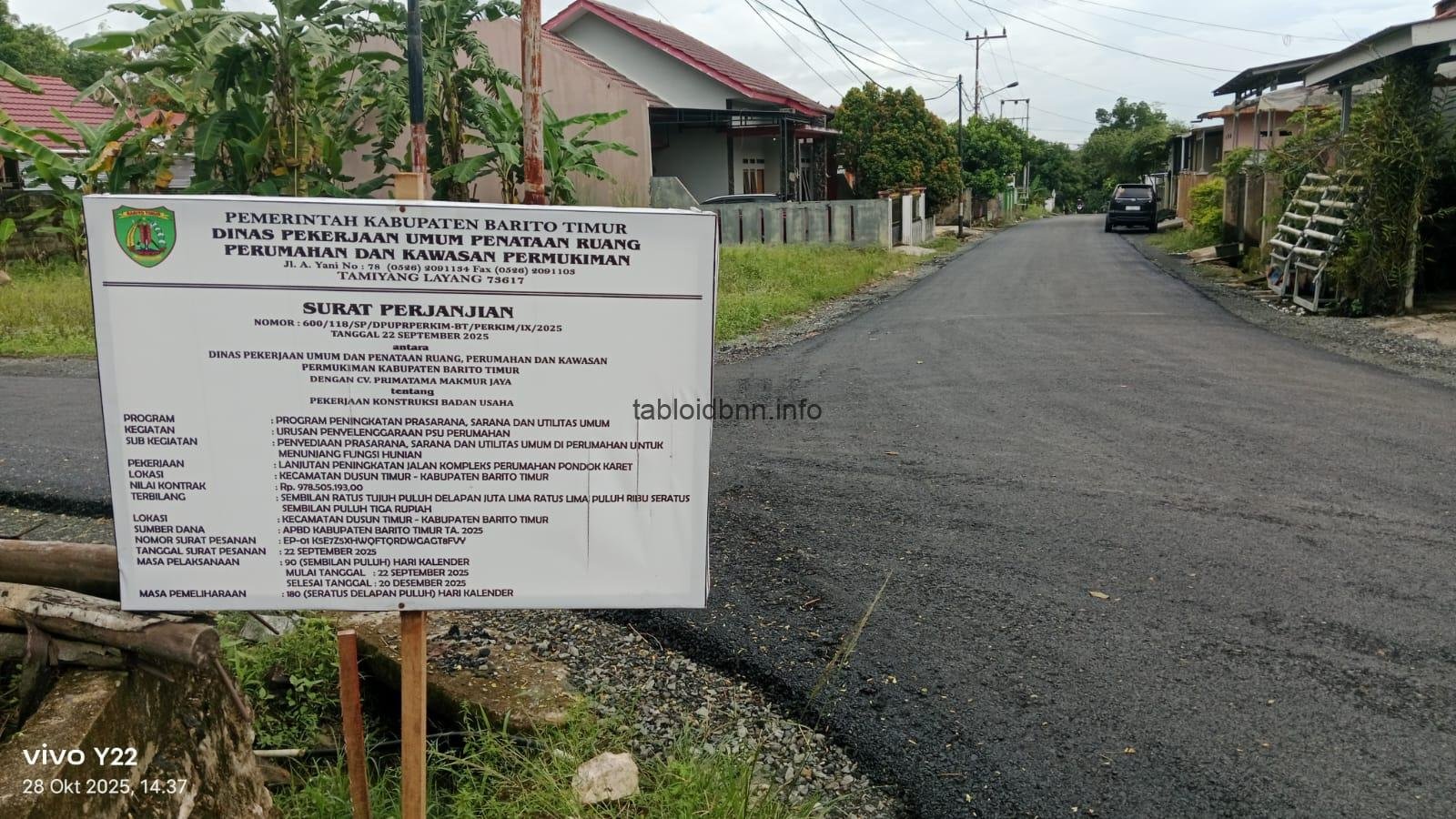 Untuk diketahui program kegiatan peningkatan prasarana, sarana dan utilitas umum yang berada di kompleks Perumahan Pondok Karet, Kecamatan Dusun Timur, kabupaten Barito Timur dengan anggaran sebesar Rp. 978.505.193,00 Rupiah yang di kerjakan oleh CV Primatama Makmur Jaya dengan batas waktu pengerjaan 90 hari Kalender. ( td )