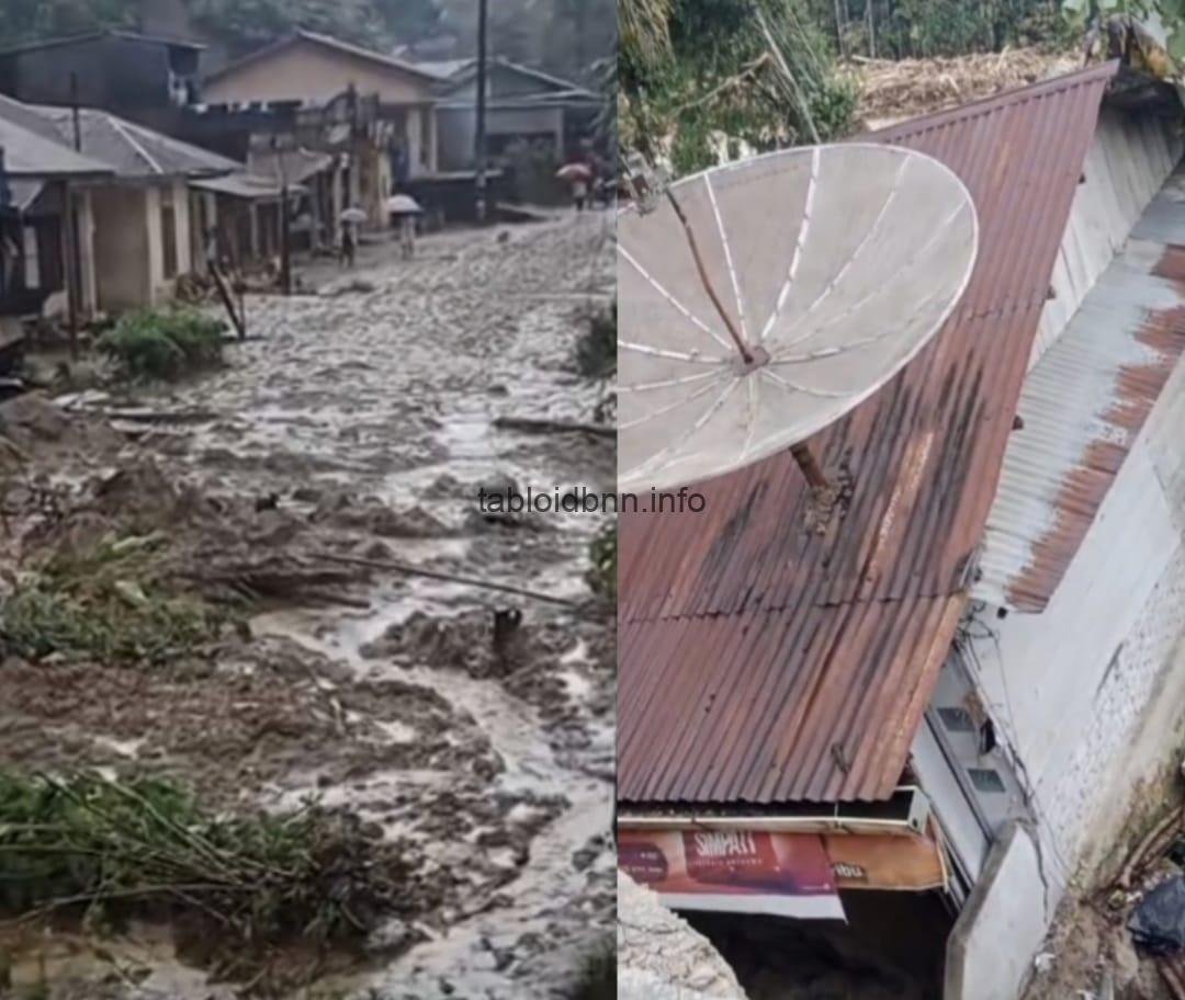 Warga masih tertegun menyaksikan kampung mereka yang biasanya hijau, berubah menjadi kubangan lumpur tebal. Setidaknya ada 3 rumah milik warga yang ambruk tak lagi dapat ditempati. Warga pagi itu hanya mampu untuk menyaksikan rumah yang roboh.
