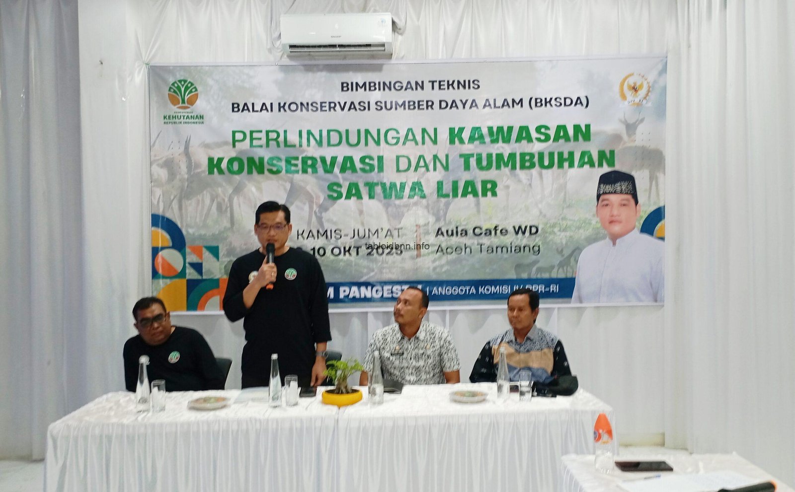 Tabloidbnn.info | Aceh Tamiang – Anggota Komisi IV DPR RI H. Ilham Pangestu Menggelar Bimbingan Teknis Balai Konservasi Sumber Daya Alam (BKSDA) Perlindungan Kawasan Konservasi dan Tumbuhan Satwa Liar di aula WD Kopi, Desa Tanah Terban Kecamatan Karang Baru, Kamis, (9/10/2025).