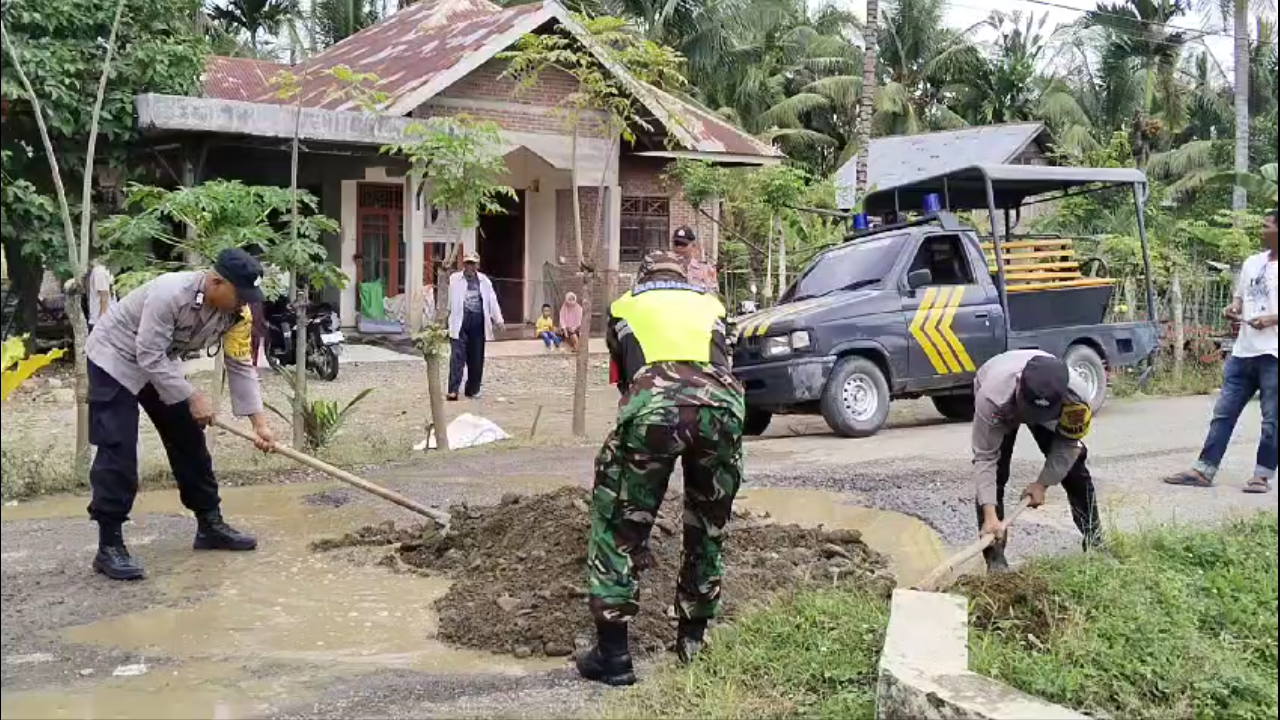 Tabloidbnn.info | Bireuen – Sejumlah personil Polsek dan Koramil Jeunieb menggelar kerja bakti menambal jalan yang berlobang di jalan penghubung Sampo Hajad menuju ke Desa Lhok kulam, Desa paya bili, Desa ule blang, Desa alue setui/ Desa uten kepaleh, Desa ule gajah dan Desa blang Senebok, pada Senin, 6 Januari 2025.