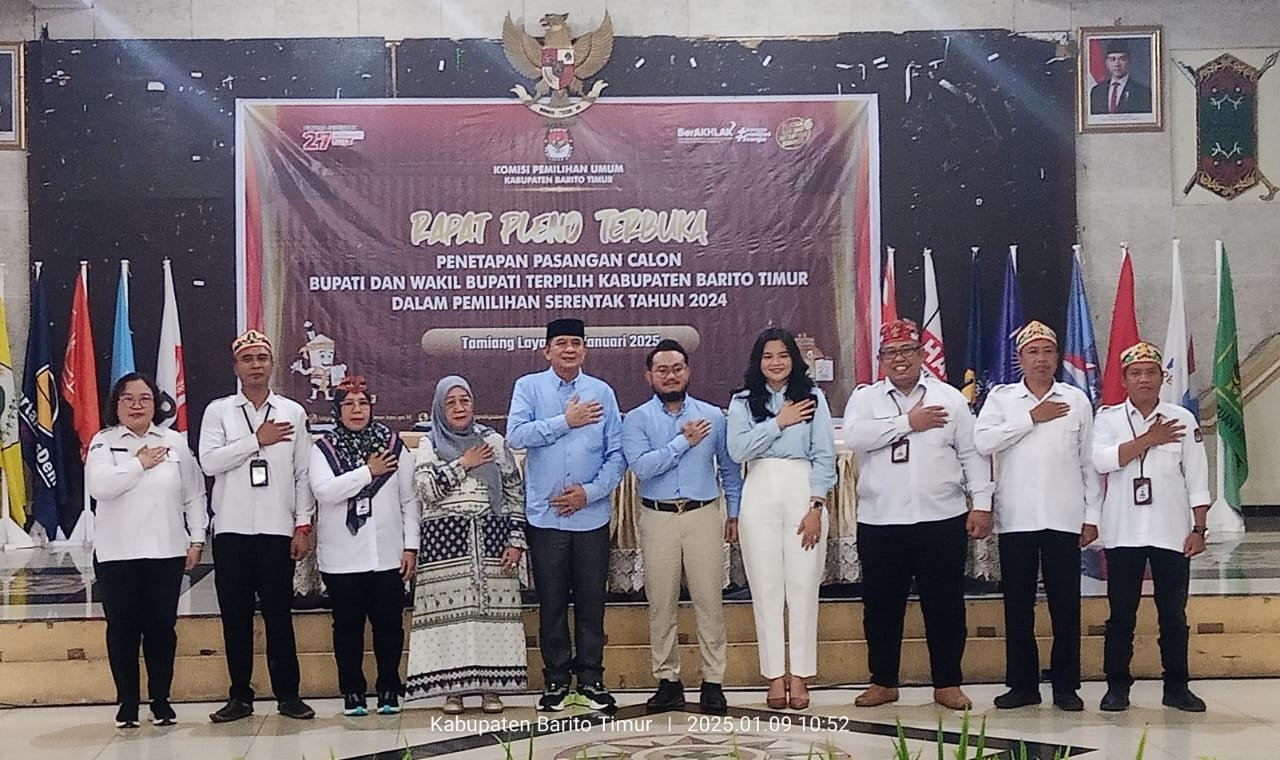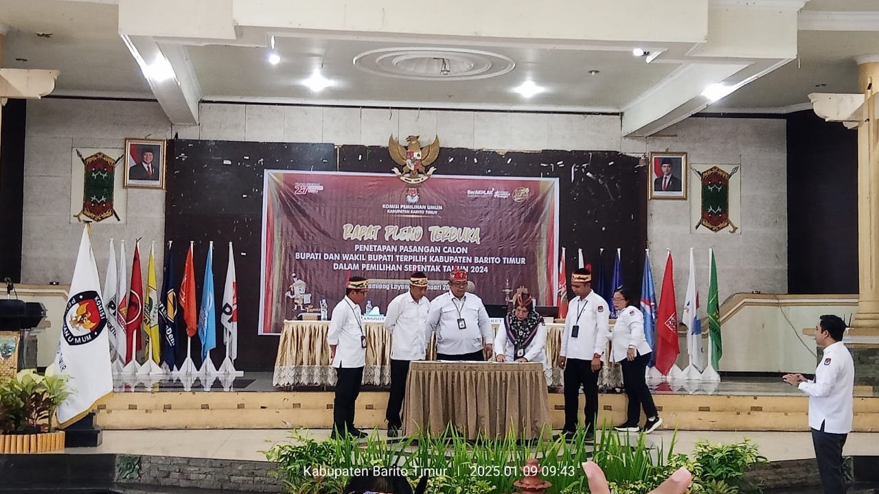 Tabloidbnn.info | Bartim – Komisi Pemilihan Umum (KPU) Kabupaten Barito Timur (Bartim) menggelar Rapat Pleno terbuka penetapan pasangan calon terpilih dalam pemilihan Kepala daerah serentak 27 November 2024. Acara yang Berlangsung di Gedung Pertemuan Umum Mantawara, Kamis (09/01/2025).