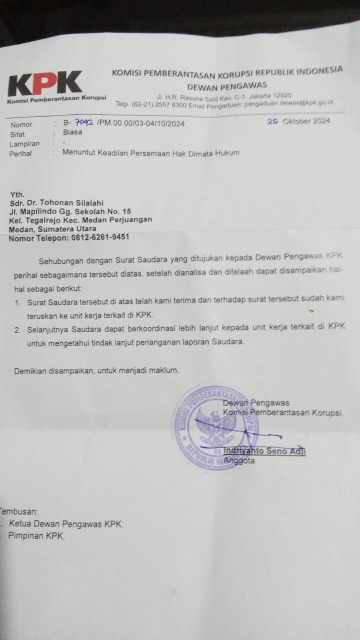 Pada surat yang diperbuat di Medan pada 04 November 2024, Tohonan Silalahi mengatakan sampai saat ini masih tetap mempertanyakan kejelasan dan kepastian hukum atas kasus/perkara eks anggota DPRDSU Periode 2009-2014 yang belum tuntas secara menyeluruh, sehingga tidak berkeadilan.
