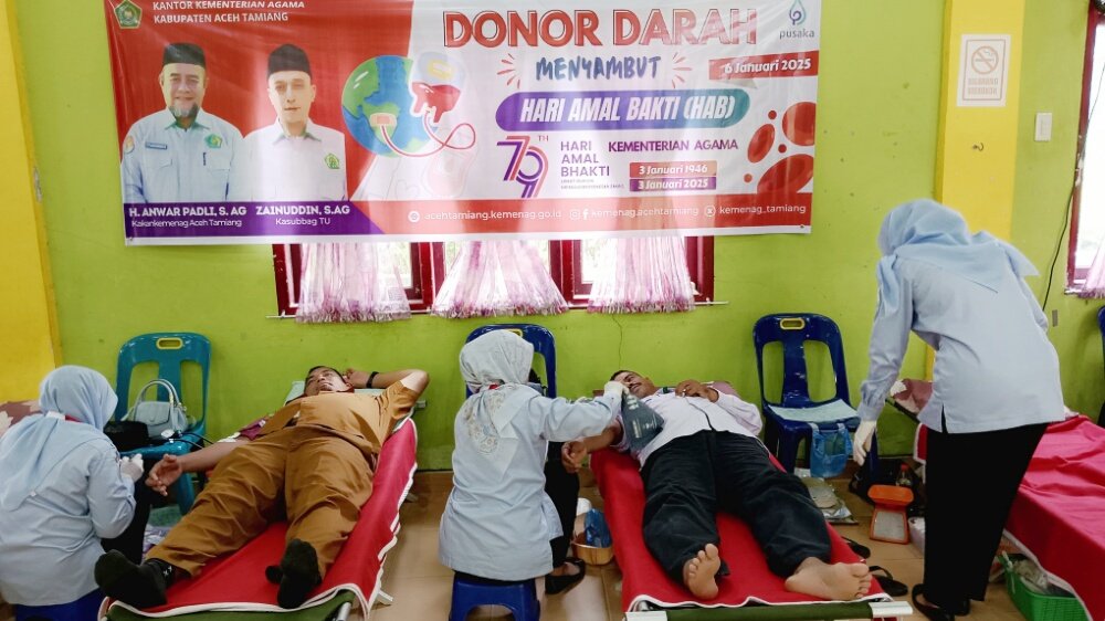 Tabloidbnn.info | Aceh Tamiang – Dalam rangka memeriahkan peringatan hari amal bhakti(HAB) Ke 79, Kementerian Agama(Kemenag) Kabupaten Aceh Tamiang menggelar donor darah yang diselenggarakan di aula Al Ikhwan Kantor Kemenag setempat, Senin, (6/1/2025).