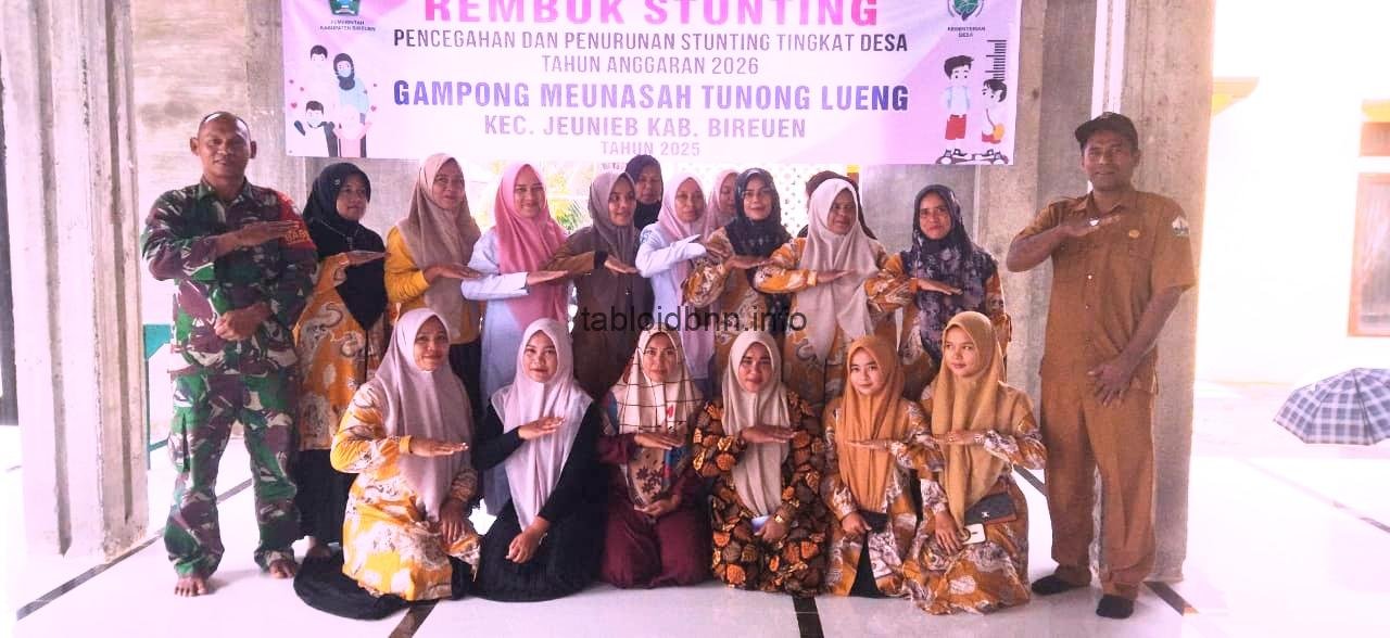 Tabloidbnn.info | ​Jeunieb, Bireuen – Pemerintah Kecamatan Jeunieb, Kabupaten Bireuen, menggelar kegiatan Rembuk Stunting tahun 2025 di Meunasah Tunong Lueng pada hari Selasa, 25 November 2025. Meskipun diguyur hujan, acara tersebut dihadiri secara antusias oleh Muspika setempat dan masyarakat desa.