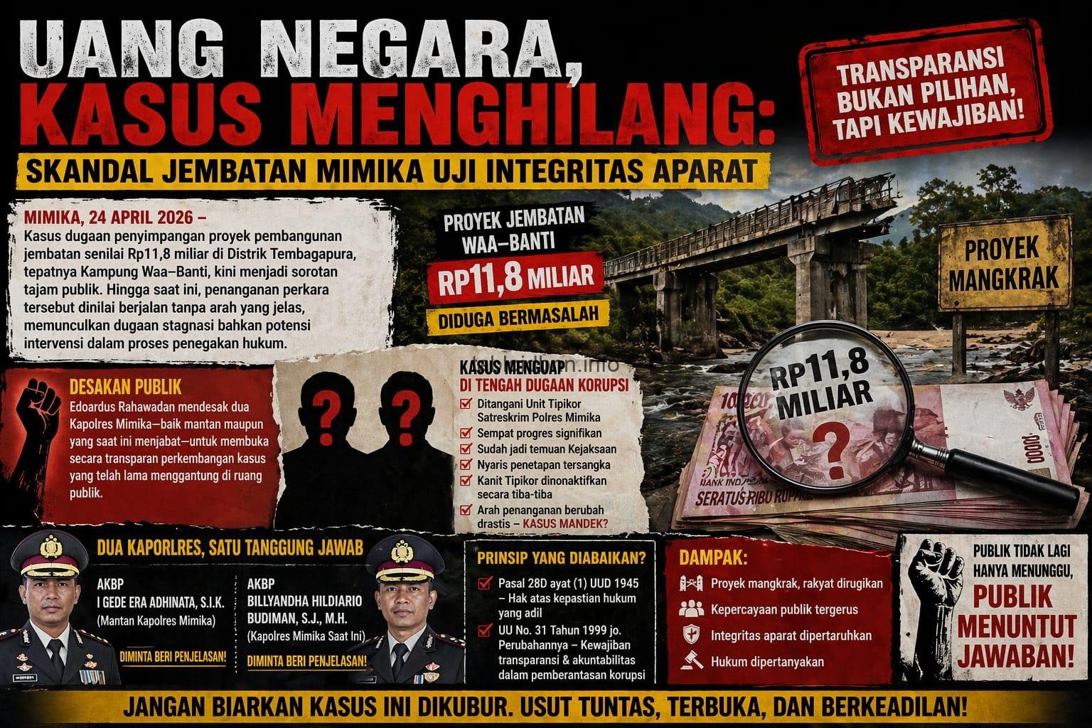 Tabloidbnn.info. Mimika, 24 April 2026— Kasus dugaan penyimpangan proyek pembangunan jembatan senilai Rp11,8 miliar di Distrik Tembagapura, tepatnya Kampung Waa–Banti, kini berubah menjadi sorotan tajam publik. Bukan hanya karena nilai proyek yang fantastis, tetapi juga karena penanganan hukum yang dinilai mandek, tak transparan, dan sarat tanda tanya.