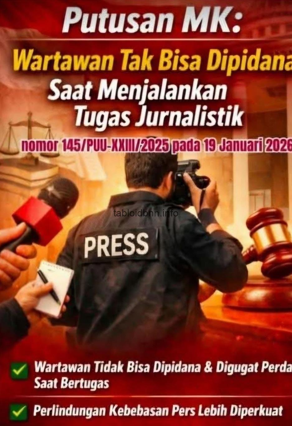 Tabloidbnn.info. Jakarta.- Mahkamah Konstitusi (MK) mempertegas perlindungan hukum terhadap wartawan dalam menjalankan tugas jurnalistik melalui Putusan MK Nomor 145/PUU-XXIII/2025 yang dibacakan pada November 2025.