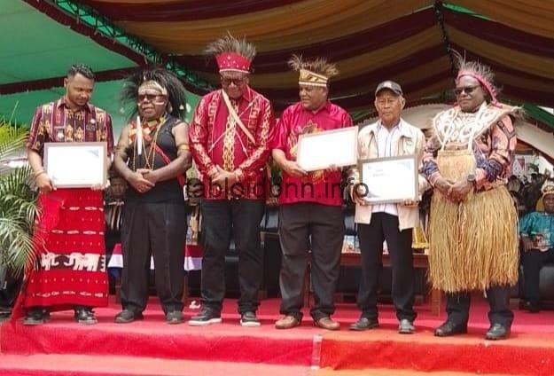 Bupati Johannes Rettob dan Wakil Bupati Emanuel Kemong serta Gubernur Meky Nawipa saat deklarasi dan penyerahan penghargaan Stop BABS 30 Kampung pada perayaan HUT Mimika