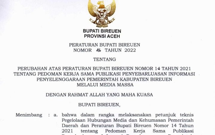 Diketahui, Perbup Bireuen Nomor 46 Tahun 2022 dengan jelas menerangkan mekanisme kerjasama publikasi penyebarluasan informasi Pemkab Bireuen melalui media massa. Pada Bab IV Pasal 9 Perbup tersebut menegaskan, media massa yang bisa kerjasama dengan pemerintah kabupaten adalah media yang berbadan hukum dan telah diverifikasi di Dewan Pers, minimal verifikasi administrasi.