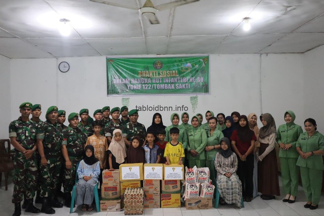 Tabloidbnn.info.Dolok Masihul. Pada peringatan Hari Ulang Infanteri ke-80 Tahun Batalyon Infanteri 122/Tombak Sakti melaksanakan kegiatan Bhakti Sosial dengan membagikan santunan berupa sembako kepada Panti Asuhan Islamic dan Madrasah Indah Mutiara Asshufi, Jumat (10/10/2025).