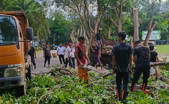 ” Pemangkasan dahan dan cabang pohon kayu ini adalah perintah Pak Bupati Aceh Tamiang agar semua pepohonan yang rimbun supaya dipangkas, agar lingkungan di pusat komplek perkantoran terlihat lebih bersih dan rapi”, sebutnya.