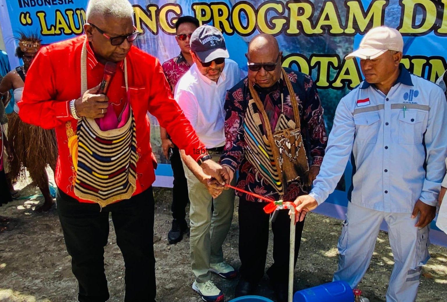 Wakil Bupati Mimika, Emanuel Kemong, membuka keran air bersih sebagai simbol dimulainya pendistribusian air bersih untuk warga Kota Timika.
