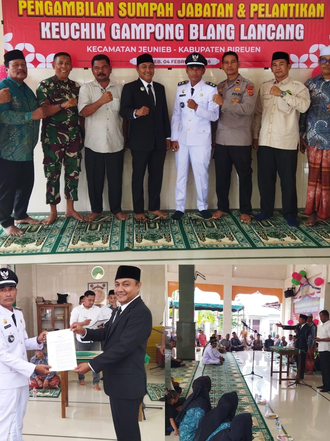 Camat Jeunieb, Muhammad Maulana Rahmat, S.IP., M.Si., secara resmi melantik Saiful Bahri sebagai Keuchik Blang Lancang. Dengan pelantikan ini, Saiful Bahri sah mengemban amanah memimpin desa tersebut untuk enam tahun ke depan.