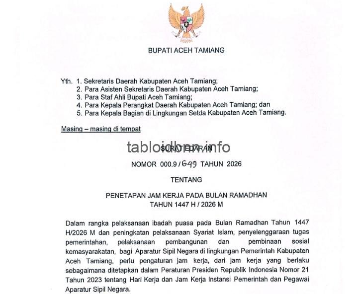 Kebijakan ini tertuang dalam Surat Edaran (SE) Nomor: 000.9/649 Tahun 2026 tentang Penetapan Jam Kerja Pada Bulan Ramadhan 1447 H, yang ditandatangani langsung oleh Bupati Aceh Tamiang, Irjen Pol. (P) Drs. Armia Pahmi, MH, pada Rabu (18/2/2026).