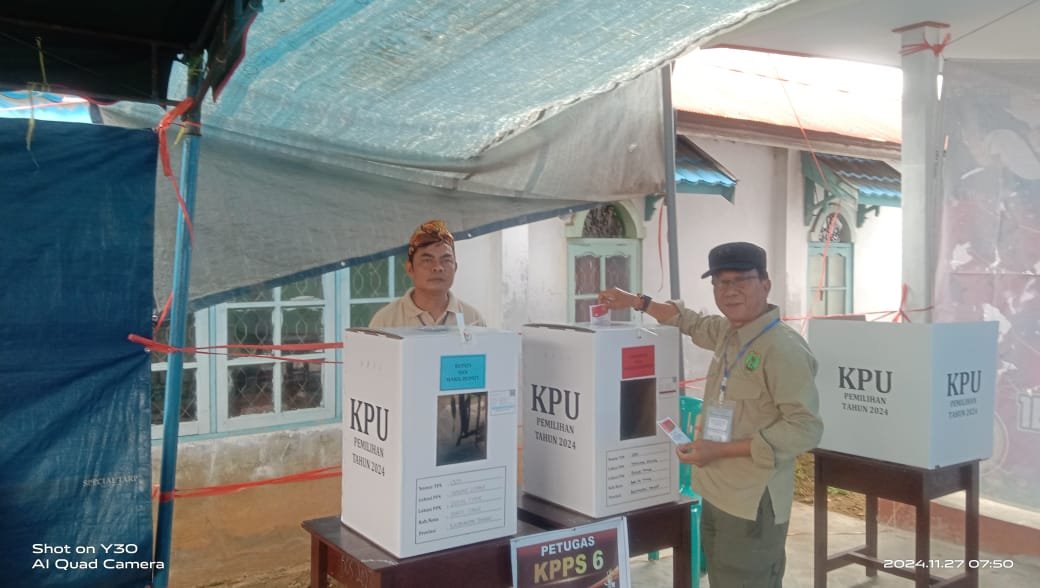 Tabloidbnn.Info | Bartim – Sekretaris daerah (Sekda) kabupaten Barito Timur (Bartim) Panahan Moetar ikuti pesta demokrasi pada Pemilihan kepala daerah (Pilkada) serentak 2024, dengan menyerahkan gak suara di Tempat Pemilihan Suara (TPS) 05 Kelurahan Tamiang Layang, Rabu (27/11/2024).