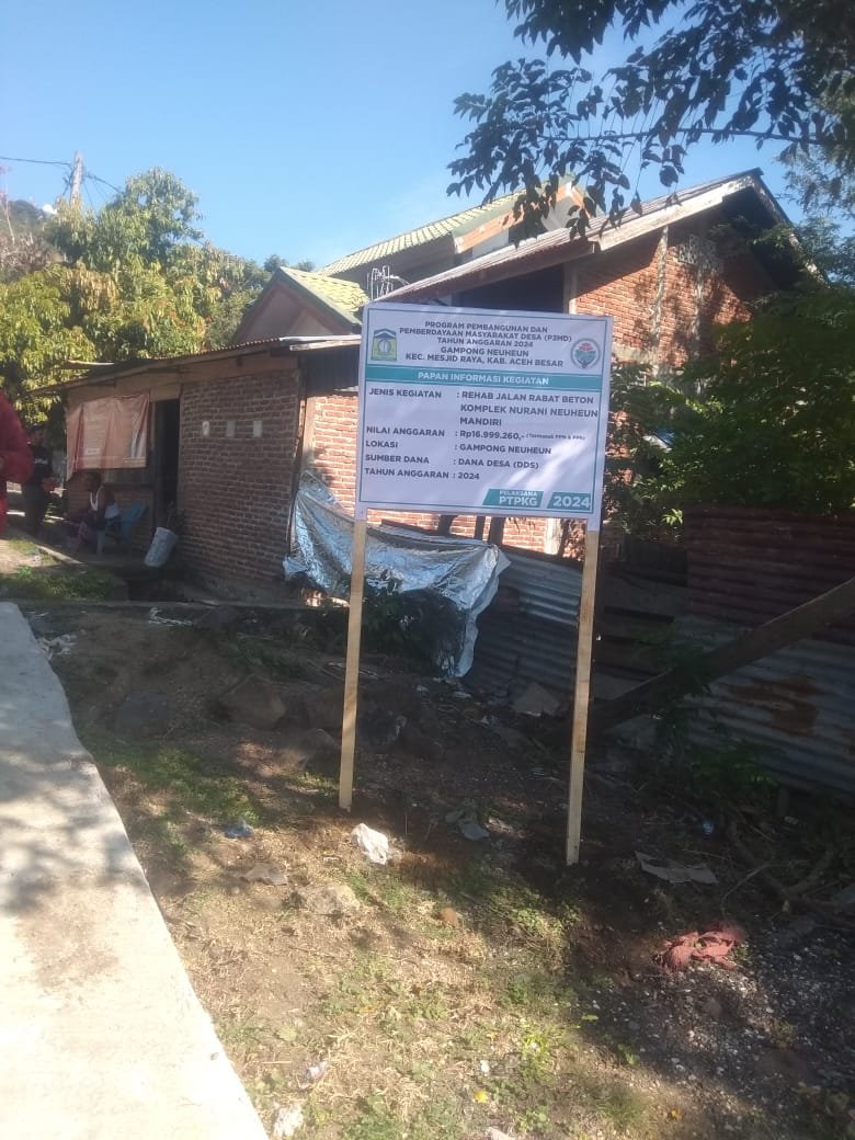 Keterangan yang dapatkan awak media via WhatsApp warga Desa Neuheun Pak Haji, (sebutan panggilannya) Setelah diberitakan oleh beberapa media Online baru dipasang papan kegiatan Proyek pada tanggal 26 Desember 2024, padahal, sejak awal sudah selesai proyek Rehab Balai dan Rabat Beton selesai dikerjakan, menurutnya sejak dimulai kegiatan pekerjaan tersebut seharusnya sudah terpasang papan informasi nama, tidak seperti ini, setelah viral diberita baru dipasang papan Proyek. Ungkapnya.