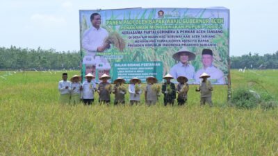 Kegiatan kemudian dilanjutkan dengan prosesi panen bersama, di mana Wakil Gubernur Aceh, Wakil Bupati Aceh Tamiang, dan para tamu undangan turun langsung ke sawah. Suasana penuh semangat dan kebersamaan ini menjadi simbol harapan baru bagi keberlanjutan pertanian di Aceh Tamiang.