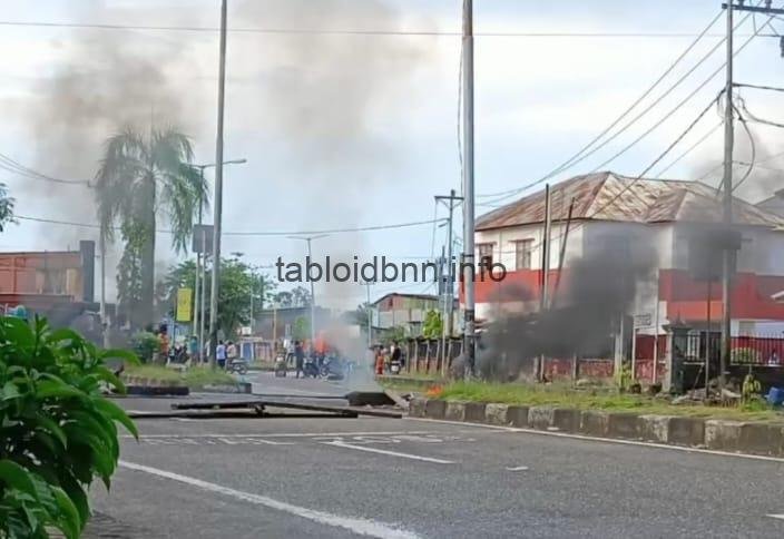 Tabloidbnn.info.Timika, – Aksi pemalangan jalan di Jalan Ahmad Yani, Distrik Mimika Baru, Mimika, Rabu (28/1/2026). Sejumlah warga memblokade akses utama di Jalan Ahmad Yani dan Jalan KH Dewantara, dipicu tewasnya seorang warga berinisial SL dalam insiden penikaman dini hari.