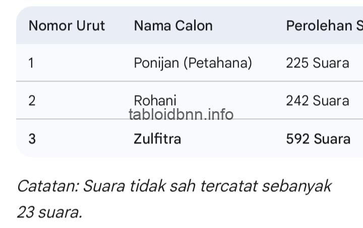 Dominasi Zulfitra terlihat jelas sejak awal penghitungan. Berikut adalah rincian perolehan suara ketiga kandidat: